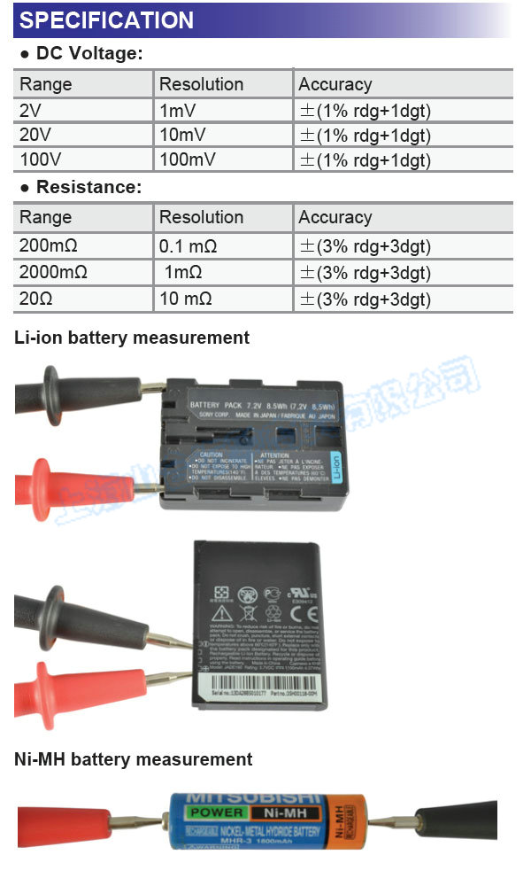 The 4-wire measurement method can reduce contact resistance and test lead resistance. The 6470 BT can also test Ni-cd, Ni-MH, Li-ion batteries.