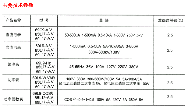 69C9、69L9电表系列A、V、W、COSφ、Hz型;85L17-A、69L17-A交流电流表