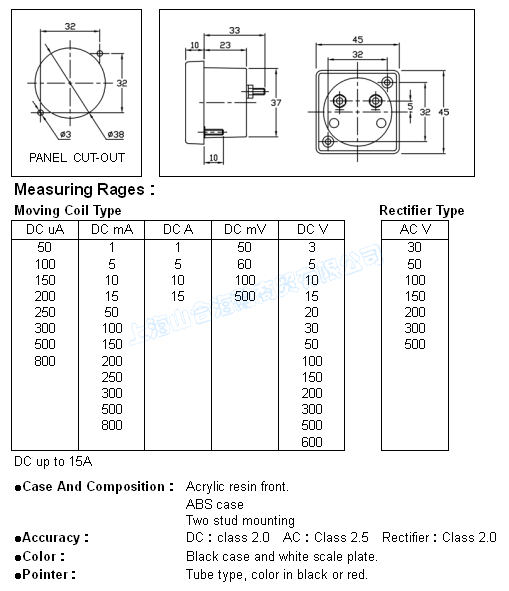 | ● 準確度 : 動圈軸心式 : 2.0 級 / 鐵片型 : 2.5 級 / 動圈式整流型 : 2.0 級 |