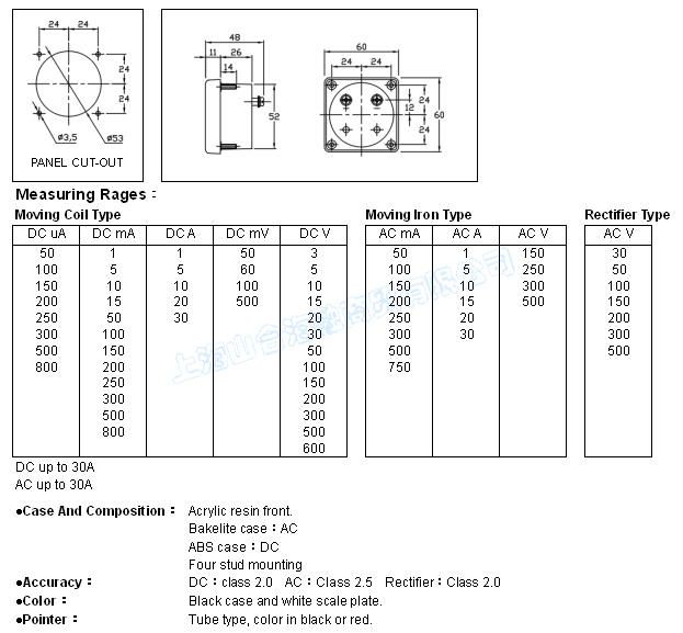 | ● 準確度 : 動圈軸心式 : 2.0 級 / 鐵片型 : 2.5 級 / 動圈式整流型 : 2.0 級 |
