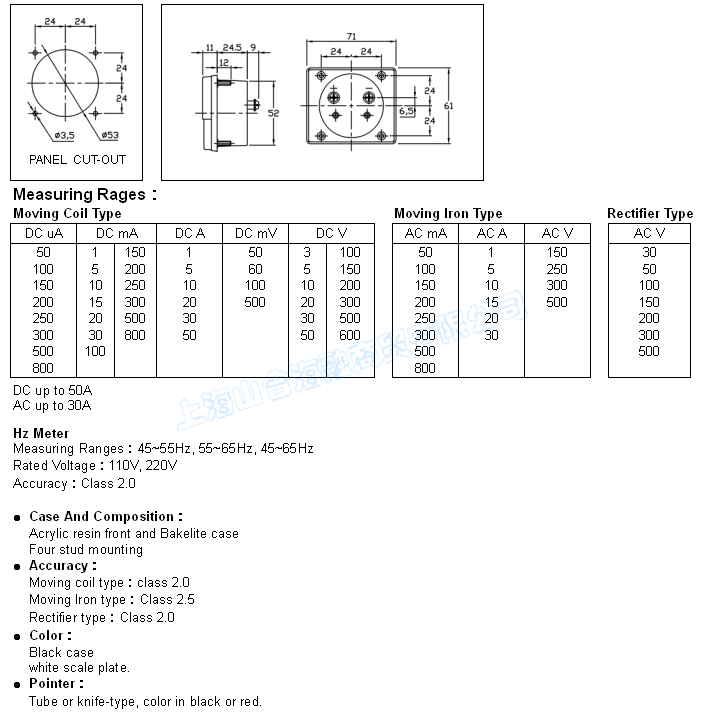 | 動圈軸心式 :2.0 級 / 鐵片型 : 2.5 級 / 動圈式整流型 :2.0 級 |