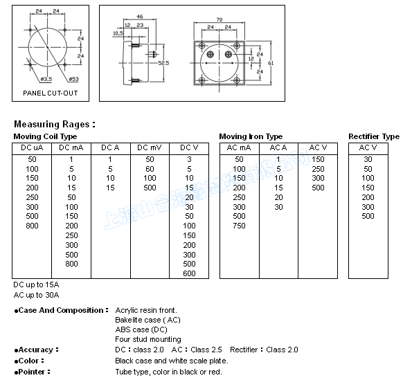 | ● 準確度 : 動圈軸心式 : 2.0 級 / 鐵片型 : 2.5 級 / 動圈式整流型 : 2.0 級 |