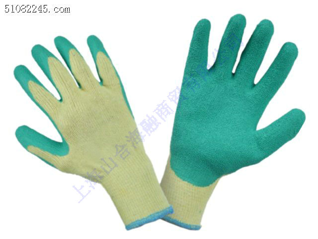 手掌和指尖处有绿色起皱天然乳胶涂层