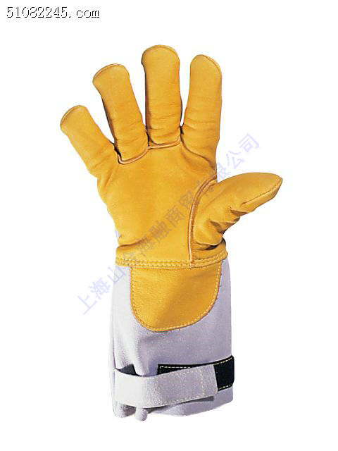 黄色防水粒面牛皮手套。 全形剪裁、拇指可以弯曲、长手套类型。 手部衬里为 Kevlar/棉针织物。 拇指和中指基部采用防水粒面皮革连接。 保护血管。 二层皮护腕。 Velcro 腕带。 采用 Kevlar 线缝制。 皮革厚度仅: 1.1/1.3 mm。