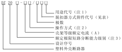 DZ20系列塑料外壳式断路器,其额定绝缘电压500V,交流50Hz或60Hz、额定工作电压380V及以下或直流额定工作电压220V及以下,其额定电流至1250A。一般作为配电用,额定电流200A及以下和400Y型的断路器亦可作为保护电动机用。在正常情况下,断路器可分别作为线路不频繁转换及电动机的不频繁起动之用。