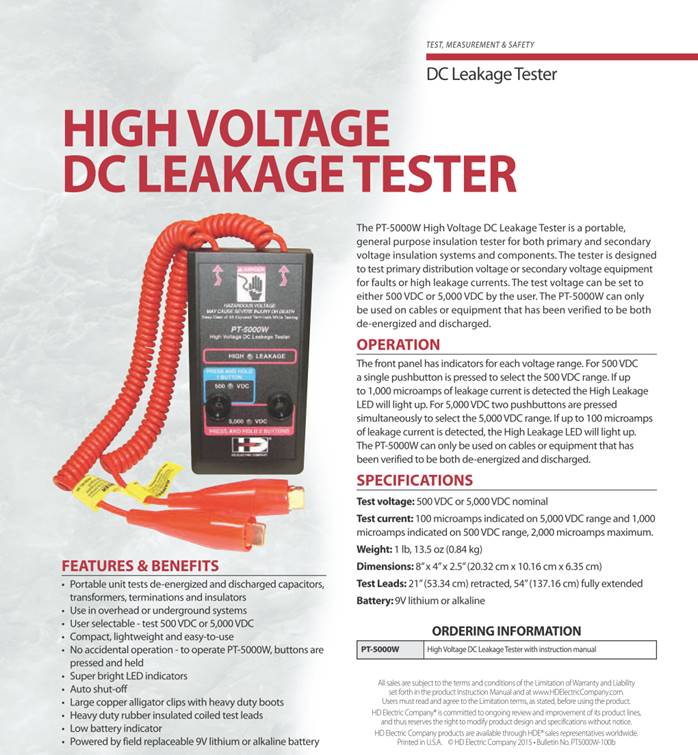 DC Leakage Tester The PT-5000W is a portable, general purpose dual voltage leakage tester designed to test primary distribution voltage or secondary voltage equipment for faults or high leakage currents. Use only on cables or equipment that have been verified to be both de-energized and discharged. The test voltage can be set by the user to either 500VDC or 5,000VDC. The PT-5000W can be used to check for leakage on cables, transformers, capacitors, joints, terminations, insulators, etc. DC Leakage Tester Features · Portable unit tests de-energized and discharged capacitors, transformers, terminations and insulators · Use in overhead or underground systems · User selectable - test 500VDC or 5,000VDC · Compact, lightweight and easy-to-use · Super bright LED indicators · Low battery indicator · Powered by field replaceable 9V lithium or alkaline battery HD Electric Company is committed to ongoing review and improvement of its product lines, and thus reserves the right to modify product design and specifications without notice.