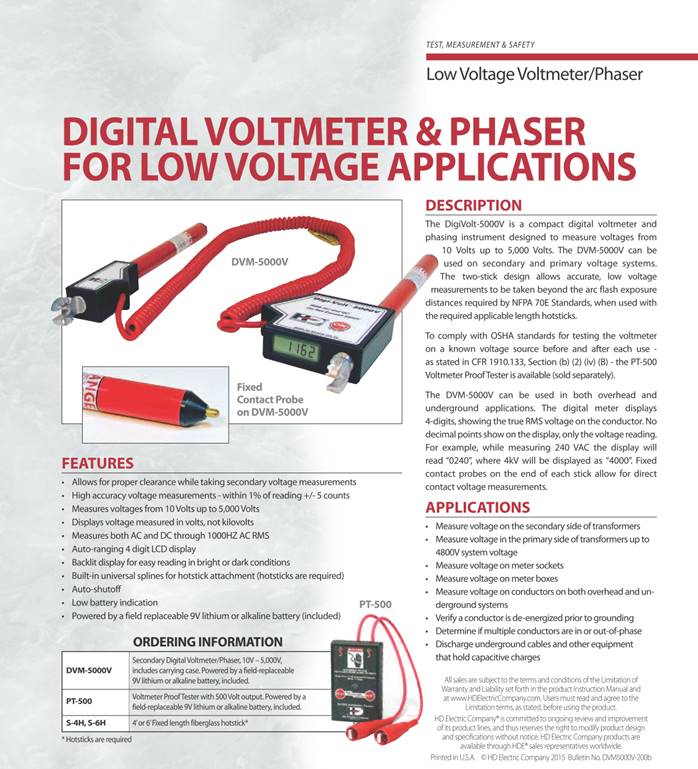 Optional Digital Voltmeter Accessories · Bushing probes for use in 15kV, 25kV and 35kV class bushings · Cable Fault Tester for testing cables for faults · Proof Tester® Voltmeter Tester to verify proper operation of voltmeters/phasers prior to use · Extension hotsticks in various lengths · Various overhead and underground probes Digital Voltmeter Features · True RMS voltage measurements up to 80kV AC/DC · Large auto-ranging LED · Back lit display for low light conditions · Coiled connecting cord is standard · Peak hold and track modes · Auto shut-off and low battery indicator · Capacitive test point mode (models DVM-25T and DVM-80T) · Universal splines for standard hot stick attachment · Powered by 9V lithium or alkaline battery · All models include a carrying case · Includes hook style overhead brass probes HD Electric Company is committed to ongoing review and improvement of its product lines, and thus reserves the right to modify product design and specifications without notice. DVM系列多功能核相仪 DVM 系列多功能核相仪参数表