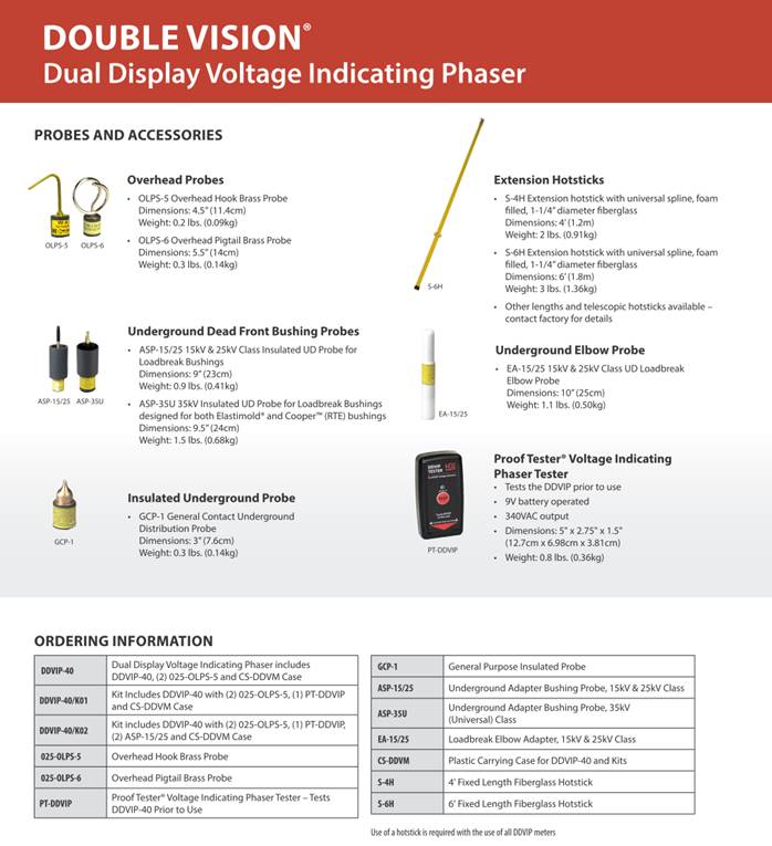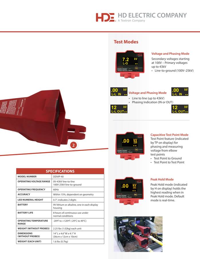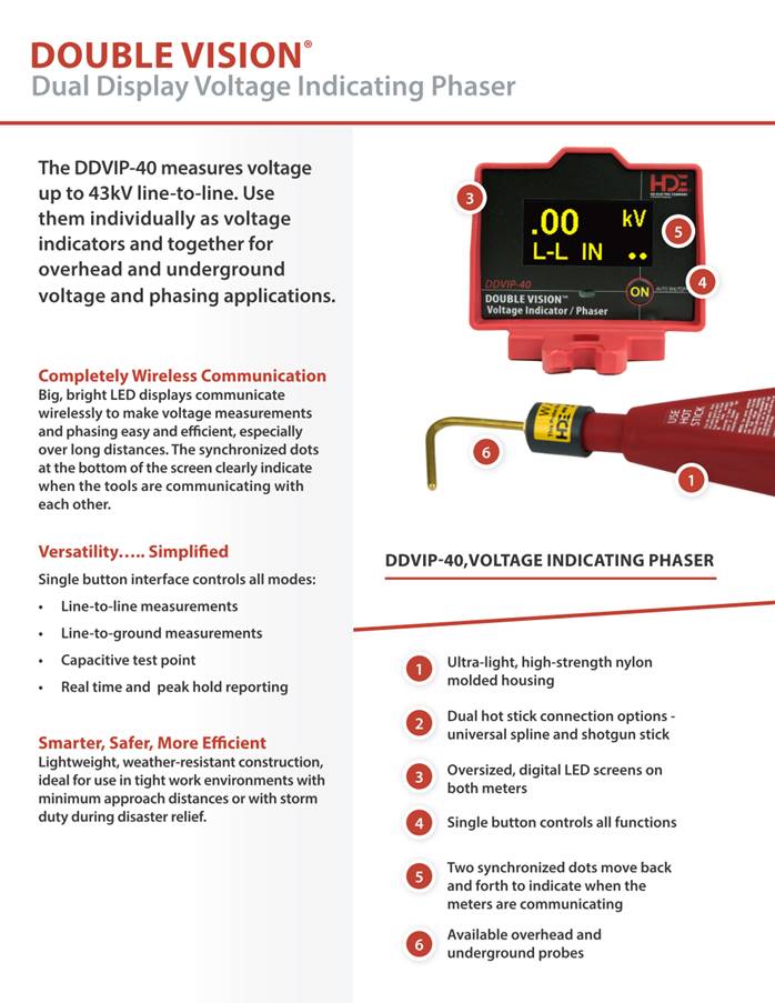 DoubleVision Dual Display Wireless Voltage Indicating Phaser The Dual Display® Voltage Indicating Phaser, model DDVIP, is a completely wireless dual display voltage indicator and phasing tool for voltages up to 43kV. It includes a pair of lightweight, single stick line-to-ground voltage indicators that communicate with each other wirelessly. The DDVIP can also be used independently as Digital Voltage Indicators. Its multiple functions include: · Expanded phasing capabilities · Two large, digital LED displays are easily read from a distance or in bright sunlight · Clear indication of in-phase or out-of-phase The DDVIP-40 measures voltage up to 43kV line-to-line. Use them individually as voltage indicators and together for overhead and underground voltage and phasing applications. Completely Wireless Communication - Big, bright LED displays communicate wirelessly to make voltage measurements and phasing easy and efficient, especially over long distances. The synchronized dots at the bottom of the screens clearly indicate when the tools are communicating with each other. For longer distance phasing up to 100 feet, the DDVIP is an ideal solution. Features and Benefits · Single button interface controls all functions: · Line-to-line measurements · Line-to-ground measurements · Capacitive test point · Real time and peak hold reporting · Ultra-light, high-strength nylon molded housing · Dual hot stick connection options - universal spline and shotgun stick · Oversized, digital LED screens on both meters · Two synchronized dots move back and forth to indicate when the meters are communicating · Available overhead and underground probes · Dual battery monitor with auto shut off · Powered by two 9V lithium or alkaline batteries in an easy to change battery case - no tools required HD Electric Company is committed to ongoing review and improvement of its product lines, and thus reserves the right to modify product design and specifications without notice. DVM系列多功能核相仪 DVM 系列多功能核相仪参数表