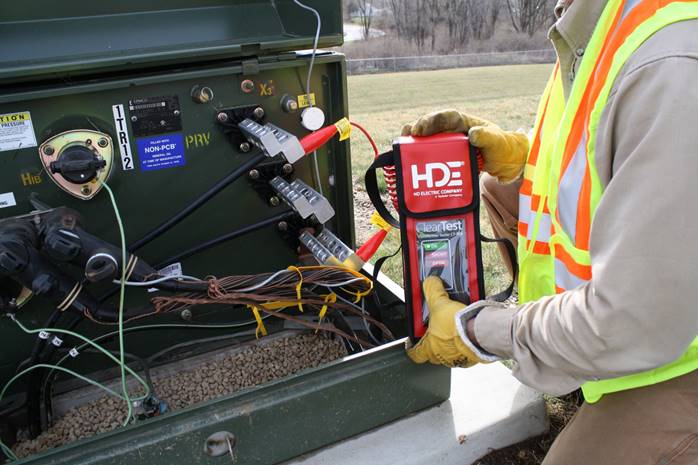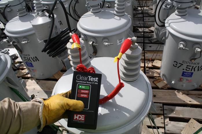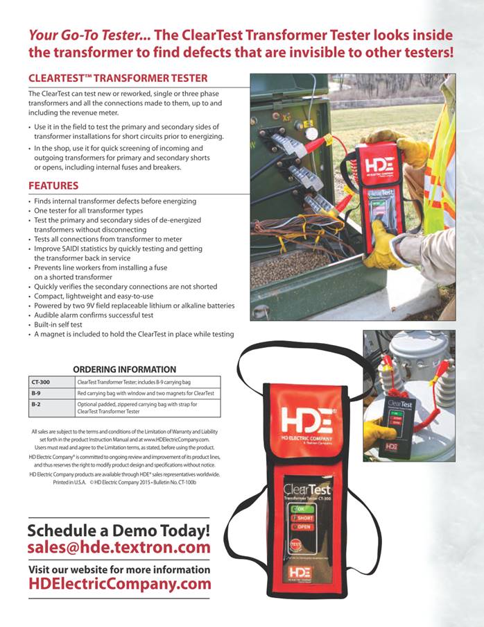 shorted turn in the primary or secondary side of a transformer ClearTest looks both inside and outside the transformer - testing the coil, core and winding as well as between the transformer and whatever it is connected to. Transformer Tester Features · Finds internal transformer defects before energizing · One tester for all transformer types · Test the primary and secondary sides of de-energized transformers without disconnecting · Tests all connections from transformer to meter · Improve SAIDI statistics by quickly testing and getting the transformer back in service · Prevents line workers from installing a fuse on a shorted transformer · Quickly verifies the secondary connections are not shorted · Compact, lightweight and easy-to-use · Powered by two 9V field replaceable lithium or alkaline batteries · Audible alarm confirms successful test · Built-in self test · A magnet is included to hold the ClearTest in place while testing HD Electric Company is committed to ongoing review and improvement of its product lines, and thus reserves the right to modify product design and specifications without notice.