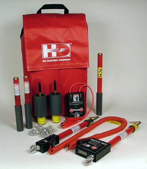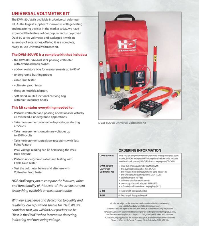The DVM-80UVK is a complete kit that includes the DVM-80UVM dual stick phasing voltmeter with overhead hook probes, add-on resistor sticks for measurements up to 80kV, underground bushing probes, cable fault tester, voltmeter proof tester, shotgun hotstick adapters and a soft-sided, multi-functional carrying bag with built-in bucket hooks.