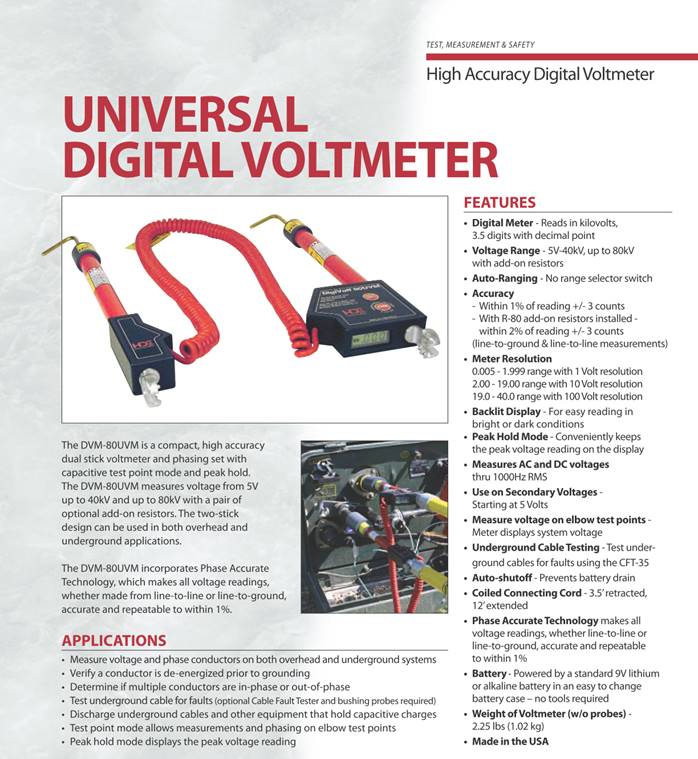 The DigiVolt® series of digital voltmeters and phasing sets is designed to take voltage measurements and perform phasing applications on system voltages up to 80kV.  The DVM-80UVM is a compact, high accuracy dual stick voltmeter and phasing set with capacitive test point mode and peak hold. The DVM-80UVM measures voltage from 5V up to 40kV and up to 80kV with a pair of optional add-on resistors. The two-stick design can be used in both overhead and underground applications. The DVM-80 units incorporate Phase Accurate Technology, which makes all voltage readings, whether made from line-to-line or line-to-ground, accurate and repeatable to within 1%.