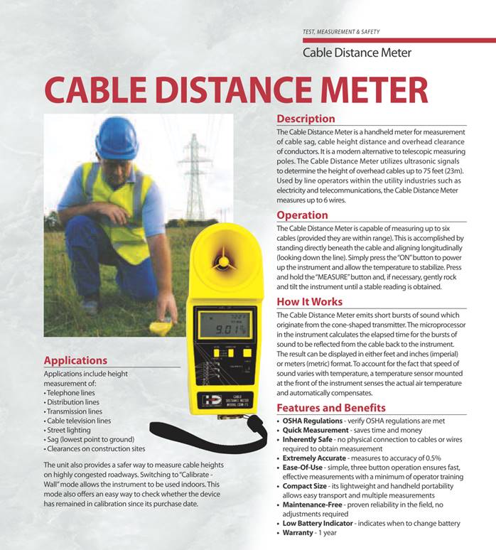 The Cable Distance Meter is a handheld device for measurement of cable sag, cable height distance and overhead clearance of conductors. It is a modern alternative to telescopic measuring poles. The Cable Distance Meter utilizes ultrasonic signals to determine the height of overhead cables up to 75 feet.