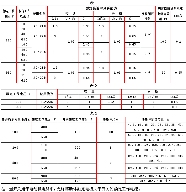 8、开关与熔断体配用关系如表3