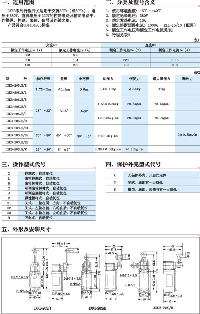 LXK3系列行程开关适用于交流50Hz(或60Hz)电压至380V直流电压到220V同极使用的控制电路及辅助电路中,作操纵、控制、限位、信号及连锁之用。 |