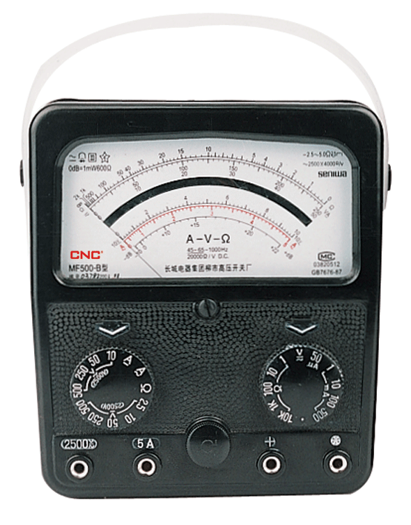 MF500-B型万用表是一种高灵敏度、多量限的携带式整流系仪表。该仪表共具有二十九个测量量限,能分别测量交直流电压、直流电流、电阻,适宜于无线电、电讯及电工事业单位作一般测量之用。