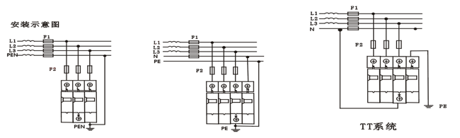 在六层以下住宅照总配电箱和分散型别墅的住房配电箱内。 ◆电涌保护器前必须加装市售63A熔断器,作为保护器后备保险装置。 ◆保护器适用于室内安装,室外应加防水措施。 ◆所有接线必须BZ牢固及KK电气联络,防雷接地应符合防雷规范要求(接地电