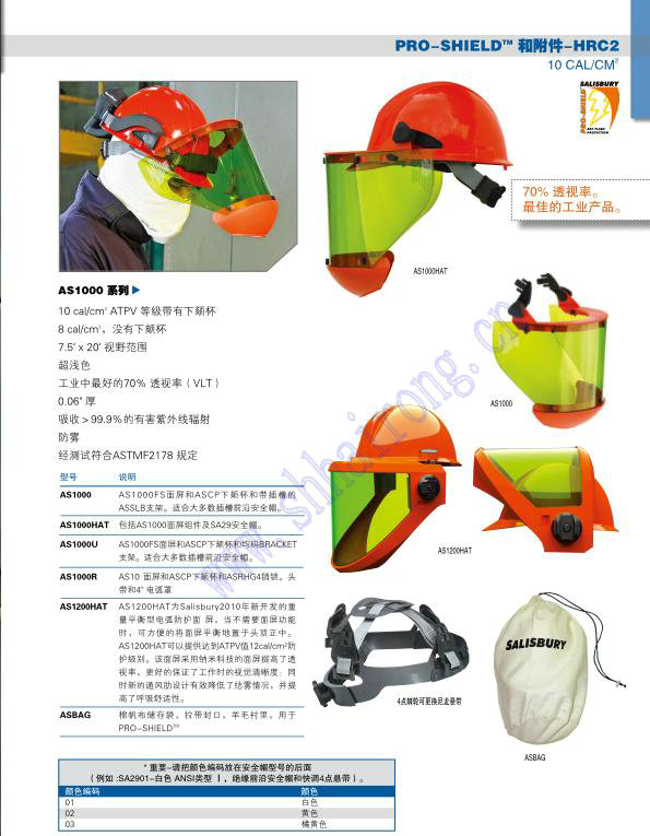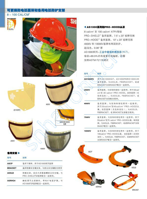 防电弧头盔/面屏: PRO-SHIELDAS1000系列及其附件: ☉加下颌杯ATPV等级达到10cal/cm2,不加下颌杯ATPV等级为8cal/cm2; ☉PRO-SHIELD面屏7.5” ×20”的视野范围; ☉面屏C浅色,工业中良好的透视率(VLT),0.06”厚; ☉4000V,10000V面屏有两层防护; ☉可吸收辐射,防雾; ☉