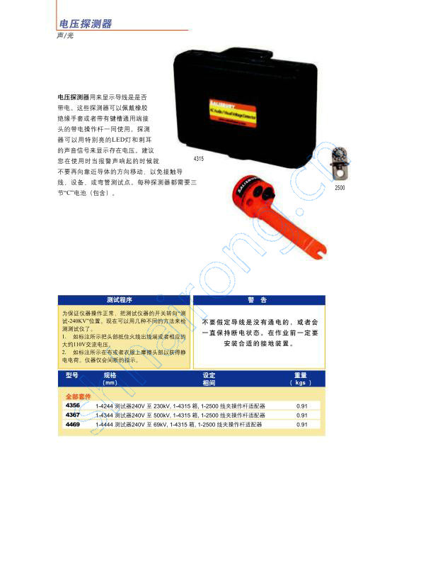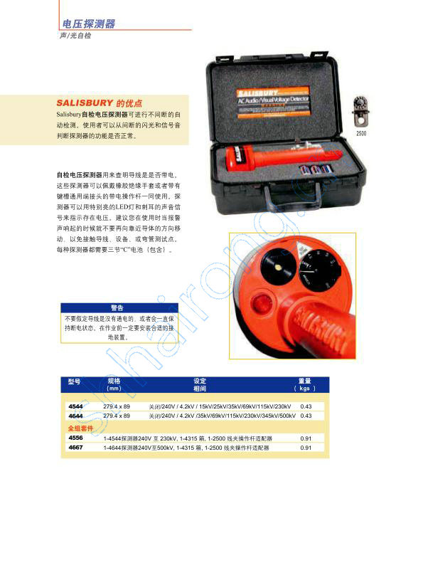 电压探测器 声/光自检 SALISBURY 的优点 Salisbury自检电压探测器可进行不间断的自 动检测。使用者可以从间断的闪光和信号音 判断探测器的功能是否正常。 2500 自检电压探测器用来查明导线是是否带电。 这些探测器可以佩戴橡胶绝缘手套或者带有 键槽通用端接头的带电操作杆一同使用。探 测器可以用特别亮的LED灯和刺耳的声音信 号来指示存在电压。建议您在使用时当报警 声响起的时候就不要再向靠近导体的方向移 动,以免接触导线、设备、或弯管测试点。 每种探测器都需要三节“C”电池(包含)。 警告 不要假定导线是没有通电的,或者会一直保 持断电状态。在作业前一定要安装合适的接 地装置。 型号 规格 设定 重量 (mm) 相间 ( kgs ) 4544 279.4 x 89 关闭/240V / 4.2kV / 15kV/25kV/35kV/69kV/115kV/230kV 0.43 4644 279.4 x 89 关闭/240V / 4.2kV /35kV/69kV/115kV/230kV/345kV/500kV 0.43 全组套件 4556 1-4544探测器240V 至 230kV, 1-4315 箱, 1-2500 线夹操作杆适配器 0.91 4667 1-4644探测器240V至500kV, 1-4315 箱, 1-2500 线夹操作杆适配器 0.91 53 电压探测器 声/光 电压探测器用来显示导线是是否 带电。这些探测器可以佩戴橡胶 绝缘手套或者带有键槽通用端接 头的带电操作杆一同使用。探测 器可以用特别亮的LED灯和刺耳 的声音信号来显示存在电压。建议 您在使用时当报警声响起的时候就 4315 不要再向靠近导体的方向移动,以免接触导 线、设备、或弯管测试点。每种探测器都需要三 节“C”电池(包含)。 2500 测试程序 警 告 为BZ仪器操作正常,把测试仪器的开关转向“测 试-240KV”位置。现在可以用几种不同的方法来检 不要假定导线是没有通电的,或者会 测测试仪了。 一直保持断电状态。在作业前一定要 1. 如标注所示把头部抵住火线出线端或者相应的 大约110V交流电压。 安装合适的接地装置。 2. 如标注所示在布或者衣服上摩擦头部以获得静 电电荷。仪器仅会间断的指示。 型号 规格 设定 重量 (mm) 相间 ( kgs ) 全部套件 4356 1-4244 测试器240V 至 230kV, 1-4315 箱, 1-2500 线夹操作杆适配器 0.91 4367 1-4344 测试器240V 至 500kV, 1-4315 箱, 1-2500 线夹操作杆适配器 0.91 4469 1-4444 测试器240V 至 69kV, 1-4315 箱, 1-2500 线夹操作杆适配器 0.91