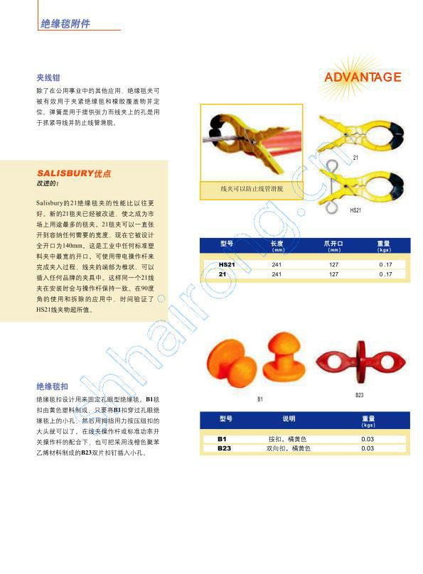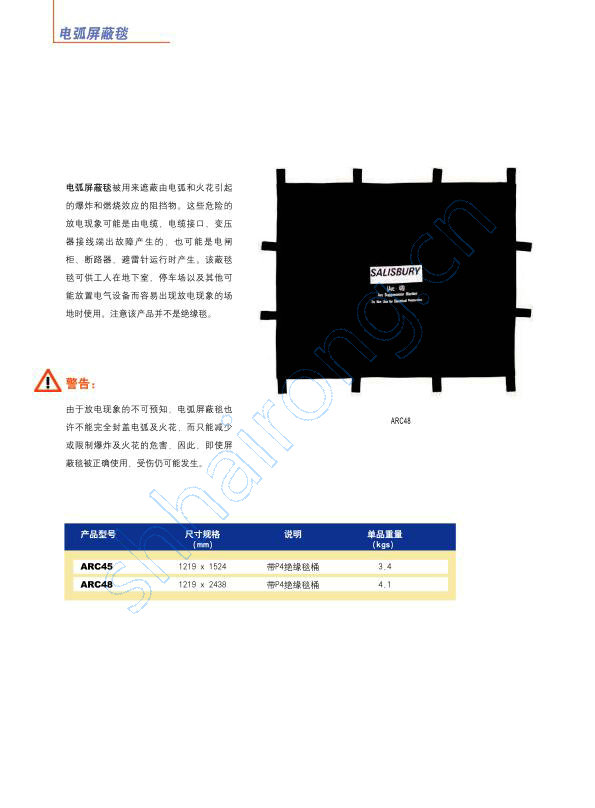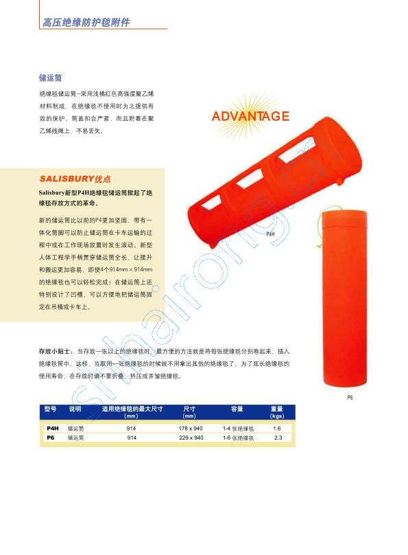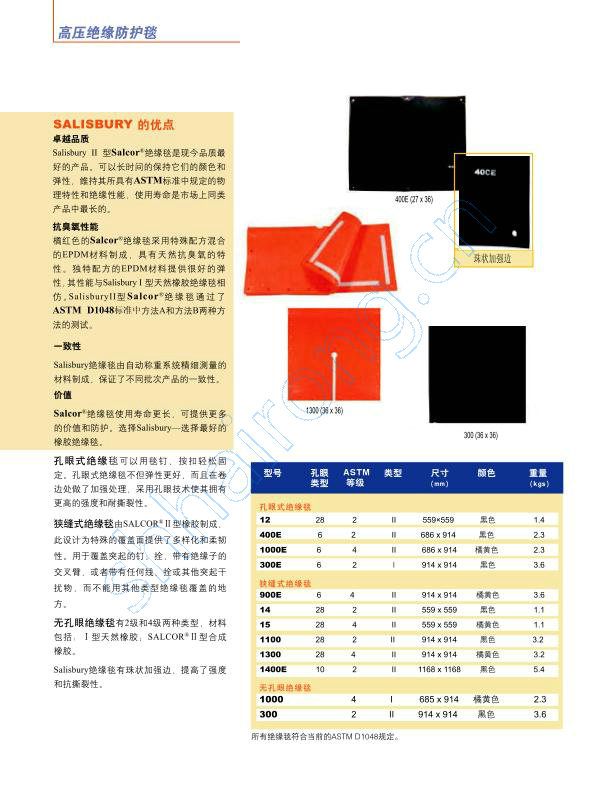 绝缘毯 B-1 高压绝缘防护毯 SALISBURY 的优点 好品质 Salisbury II 型Salcor绝缘毯 可以长时间的保持它们的颜色和 弹性,维持其所具有 物 理特性和绝缘性能,使用寿命长 性能 橘红色的Salcor?绝缘毯采用特殊配方混合 的EPDM材料制成,具有天然的特 珠状加强边 性。配方的EPDM材料提供很好的弹 性,其性能与Salisbury I 型TRXJ绝缘毯相 仿。SalisburyII型Salcor?绝缘毯通过了 方法A和方法B两种方 法的测试。 一致性 Salisbury绝缘毯由自动称重系统精细测量的 材料制成,BZ了不同批次产品的一致性。 价值 Salcor绝缘毯使用寿命更长,可提供更多? 1300 (36 x 36) 的价值和防护。选择Salisbury—选择好的 橡胶绝缘毯。 300 (36 x 36) 孔眼式绝缘毯可以用毯钉、按扣轻松固 定。孔眼式绝缘毯不但弹性更好,而且在卷 型号 孔眼 ASTM 类型 尺寸 颜色 重量 类型 等级 (mm) (kgs)边处做了加强处理,采用孔眼技术使其拥有 更高的强度和耐撕裂性。 孔眼式绝缘毯 ? 12 28 2 II 559×559 黑色 1.4狭缝式绝缘毯由SALCORⅡ型橡胶制成, 此设计为特殊的覆盖面提供了多样化和柔韧 400E 6 2 II 686 x 914 黑色 2.3性。用于覆盖突起的钉、拴,带有绝缘子的 1000E 6 4 II 686 x 914 橘黄色 2.3交叉臂,或者带有不同线、拴或其他突起干 300E 6 2 Ⅰ 914 x 914 黑色 3.6扰物,而不能用其他类型绝缘毯覆盖的地 狭缝式绝缘毯 方。 900E 6 4 II 914 x 914 橘黄色 3.6 14 28 2 II 559 x 559 黑色 1.1无孔眼绝缘毯有2级和4级两种类型,材料 15 28 4 II 559 x 559 橘黄色 1.1包括:Ⅰ型TRXJ;SALCORⅡ型合成? 1100 28 2 II 914 x 914 黑色 3.2橡胶。 1300 28 4 II 914 x 914 橘黄色 3.2Salisbury绝缘毯有珠状加强边,提高了强度 1400E 10 2 II 1168 x 1168 黑色 5.4和抗撕裂性。 无孔眼绝缘毯 1000 4 I 685 x 914 橘黄色 2.3 300 2 II 914 x 914 黑色 3.6 15 绝缘毯附件 夹线钳 ADVANTAGE除了在公用事业中的其他应用,绝缘毯夹可 被有效用于夹紧绝缘毯和橡胶覆盖物并定 位。弹簧是用于提供张力而线夹上的孔是用 于抓紧导线并防止线管滑脱。 21 SALISBURY优点 改进的! 线夹可以防止线管滑脱 Salisbury的21绝缘毯夹的性能 更 好。新的21毯夹已经被改进,使之成为市 HS21 场上用途多的毯夹之一。21毯夹可以一直张 开到容纳不同需要的宽度,现在它被设计 全开口为140mm。这是工业中不同标准塑 型号 长度 爪开口 重量料夹中Z宽的开口。可使用带电操作杆来 (mm) (mm) (kgs)完成夹入过程,线夹的端部为椎状,可以 HS21 241 127 0 .17插入不同品牌的夹具中。这样同一个21线 21 241 127 0 .17夹在安装时会与操作杆保持一致。在90度 角的使用和拆除的应用中,时间验证了 HS21线夹物C所值。 绝缘毯扣 绝缘毯扣设计用来固定孔眼型绝缘毯。B1毯 B1 B23 扣由黄色塑料制成,只要将B1扣穿过孔眼绝 缘毯上的小孔,然后用拇指用力按压纽扣的 型号 说明 重量大头就可以了。在线夹操作杆或标准功率开 (kgs)关操作杆的配合下,也可把采用浅橙色聚苯 B1 按扣,橘黄色 0.03乙烯材料制成的B23双片扣钉插入小孔。 B23 双向扣,橘黄色 0.03 16 绝缘毯附件 高压绝缘防护毯附件 储运筒 绝缘毯储运筒-采用浅橘红色高强度聚乙烯 材料制成,在绝缘毯不使用时为之提供有 效的保护。筒盖扣合严紧,而且附着在聚 ADVANTAGE 乙烯线绳上,不易丢失。 SALISBURY优点 Salisbury新型P4H绝缘毯储运筒掀起了绝 缘毯存放方式的GM。 新的储运筒比以前的P4更加坚固,带有一 体化筒脚可以防止储运筒在卡车运输的过 P4H 程中或在工作现场放置时发生滚动。新型 人体工程学手柄贯穿储运筒全长,让提升 和搬运更加容易,即使4个914mm×914mm 的绝缘毯也可以轻松完成!在储运筒上还 特别设计了凹槽,可以方便地把储运筒固 定在吊桶或卡车上。 存放小贴士: 当存放一张以上的绝缘毯时,Z方便的方法就是将每张绝缘毯分别卷起来,插入 绝缘毯筒中。这样,当取用一张绝缘毯的时候就不用拿出其他的绝缘毯了。为了延长绝缘毯的 使用寿命,在存放时请不要折叠、挤压或弄皱绝缘毯。 P6 型号 说明 适用绝缘毯的Z大尺寸 尺寸 容量 重量 (mm) (mm) (kgs) P4H 储运筒 914 178 x 940 1-4 张绝缘毯 1.6 P6 储运筒 914 229 x 940 1-6 张绝缘毯 2.3 17 电弧屏蔽毯 电弧屏蔽毯被用来遮蔽由电弧和火花引起 的爆炸和燃烧效应的阻挡物。这些危险的 放电现象可能是由电缆、电缆接口、变压 器接线端出故障产生的,也可能是电闸 柜、断路器、避雷针运行时产生。该蔽毯 毯可供工人在地下室、停车场以及其他可 能放置电气设备而容易出现放电现象的场 地时使用。注意该产品并不是绝缘毯。 警告: 由于放电现象的不可预知,电弧屏蔽毯也 许不能WQ封盖电弧及火花,而只能减少 ARC48 或限制爆炸及火花的危害,因此,即使屏 蔽毯被正确使用,受伤仍可能发生。 产品型号 尺寸规格 说明 单品重量 (mm) (kgs) ARC45 1219 x 1524 带P4绝缘毯桶 3.4 ARC48 1219 x 2438 带P4绝缘毯桶 4.1