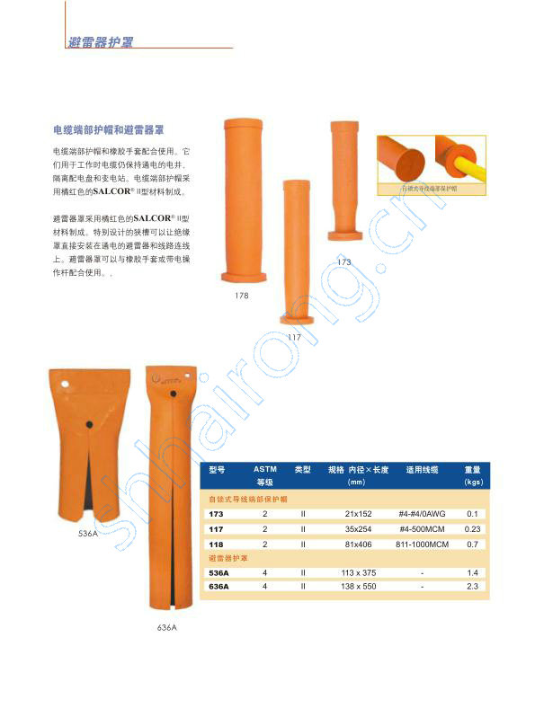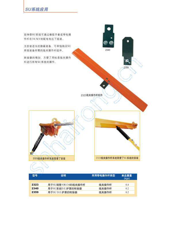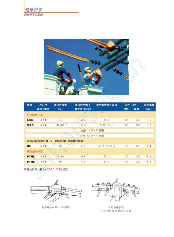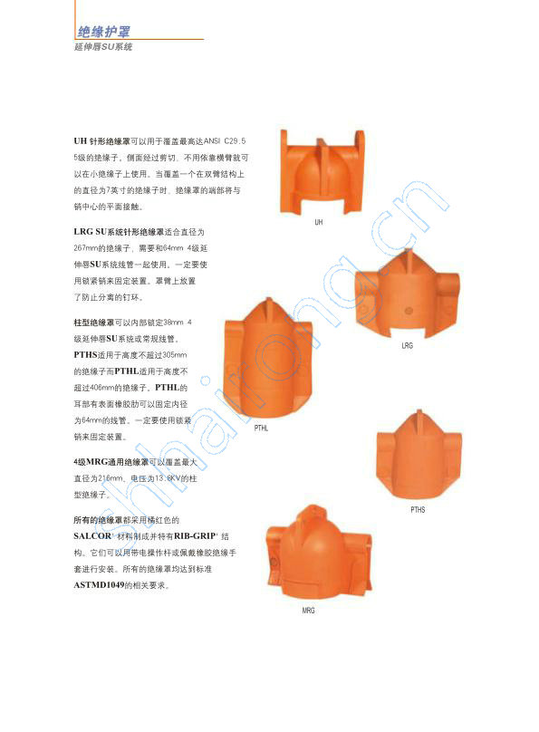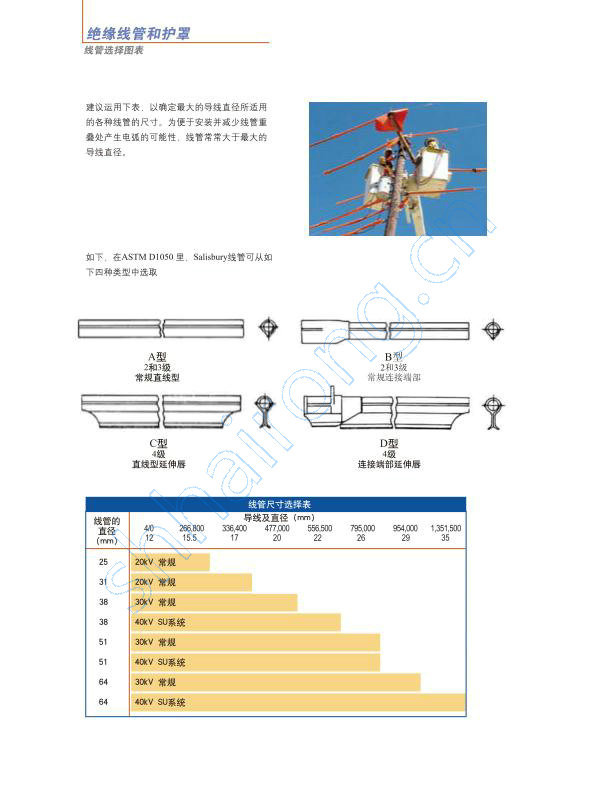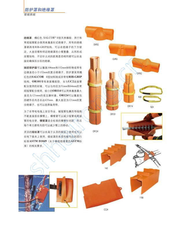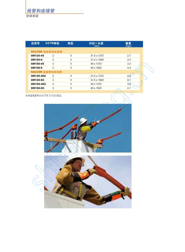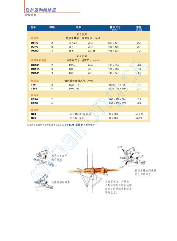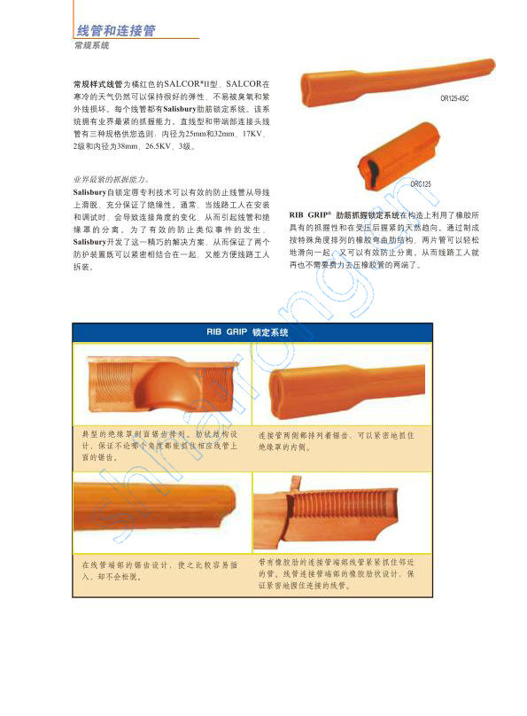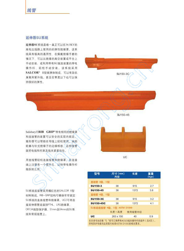 线管和连接管 常规系统 常规样式线管为橘红色的SALCORII型,SALCOR在? 寒冷的天气仍然可以保持很好的弹性,不易被CY和Z OR125-45C WX损坏。每个线管都有Salisbury肋筋锁定系统。该系 统拥有紧的抓握能力。直线型和带端部连接头线 管有三种规格供您选则:内径为25mm和32mm,17KV, 2级和内径为38mm,26.5KV,3级。 ORC125 Salisbury自锁定唇技术可以有效的防止线管从导线 上滑脱,充分BZ了绝缘性。通常,当线路工人在安装 RIB GRIP 肋筋抓握锁定系统在构造上利用了橡胶所? 和调试时,会导致连接角度的变化,从而引起线管和绝 缘罩的分离。为了有效的防止类似事件的发生, 具有的抓握性和在受压后握紧的天然趋向。通过制成 Salisbury开发了这一精巧的解决方案,从而BZ了两个 按特殊角度排列的橡胶弯曲肋结构,两片管可以轻松 防护装置既可以紧密相结合在一起,又能方便线路工人 地滑向一起,又可以有效防止分离。从而线路工人就 拆装。 再也不需要费力去压橡胶管的两端了。 RIB GRIP 锁定系统 绝缘罩剖面锯齿排列。肋状结构设 连接管两侧都排列着锯齿,可以紧密地抓住 计,BZ不论哪个角度都能抓住相应线管上 绝缘罩的内侧。 面的锯齿。 在线管端部的锯齿设计,使之比较容易插 带有橡胶肋的连接管端部线管紧紧抓住邻近 入,却不会松脱。 的管。线管连接管端部的橡胶肋状设计,保 证紧密地握住连接的线管。 4 线管和连接管 线管和连接管 常规系统 目录号 ASTM等级 类型 内径×长度 重量 (mm) (kgs) SALCOR 连接管端部线管 OR125-45 2 II 31.5 x 1372 2.7 OR125-6 2 II 31.5 x 1820 3.4 OR150-45 3 II 40 x 1372 3.2 OR150-6 3 II 40 x 1820 4.3 SALCOR 连接管端部线管 OR125-45C 2 II 31.5 x 1372 2.9 OR125-6C 2 II 31.5 x 1820 4.1 OR150-45C 3 II 40 x 1372 3.6 OR150-6C 3 II 40 x 1820 4.1 (kgs) 5 线管 延伸唇SU系统 延伸唇SU系统是 真正可以在34.5KV的 高电压线路上使用的的弹性绝缘罩。该系 统具有极高的通用性,在佩戴绝缘手套的 情况下,可以从绝缘的高空装置或平台上 手动安装;或利用带有SU施放装置的带电 操作杆,轻松手动安装。该系统采用 SALCOR II型高弹体制成,可以有效抗? SU150-3C CY和ZWX。甚至在零度以下也可以保 持很好的弹性。 SU150-45 Salisbury的RIB GRIP带有相同的绝缘罩? 和连接管的装置可以安全的实现内锁定。 锥形唇可以帮助在导线上轻松使用。端部 轮廓与针式绝缘子的边缘相容,这样线管 就把电线和托架及线夹紧紧包住。 用直线管轻松连接线管和绝缘罩。在连接 UC 端上注塑有一个提升孔,以供带电操作杆 做拆卸之用。 长度 内径 (kgs) 直线管 4级,II型 SU150-3 38 915 2.7 SU系统连接管采用橘红色的SALCOR II型 SU150-45 38 1372 3.8 材料制成。RIB-GRIP结构可确保牢牢锁定 直线管 4级,II型 SU系统的直条线管和绝缘罩。UC2可将连 SU150-3C 38 915 3.2 接延伸唇管连接到PTHL、LRG绝缘罩、 SU150-45C 38 1372 4.1 OR134端部保护器、51mm及64mm的SU系 SU系统连接管 4级,II型 ASTM D1049 统和常规线管上。 长度×高度 使用线管内径 UC 263 x 150 40 0.9 在目录号加后缀“E“即可订购带有#2323线夹操作杆的组件(见8页)。 6 线管和连接管 SU系统应用 延伸唇SU系统可通过橡胶手套或带电操 作杆在34.5kV的配电电压下组装。 为安装适当的隐蔽装备,可单独购买SU 系统装备所需的线夹操作杆组件。 2340 转接器的增加,方便了用标准线夹操作 杆进行所有SU系统的操作。 2359 2323线夹操作杆组件 2323线夹操作杆系统简便了安装 2323线夹操作杆系统简便了SU系统的安装 型号 说明 所用带电操作杆类型 单品重量 (kgs) 2323 用于SU线管/OR134的线夹操作杆 线夹操作杆 0.4 2340 用于SU系统D.E.护罩的转接器 线夹操作杆 0.2 2359 用于SU D.E.护罩的转接器 线夹操作杆 0.2 7 防护罩和绝缘罩 常规系统 绝缘罩,橘红色,SALCOR?II型TRXJ,用于和 常规线管配合使用来覆盖针式绝缘子。所有的绝缘 罩都具有RIB-GRIP结构,可以在绝缘子的下方锁 OKRG 定。大直径臂和邻近绝缘罩的小臂重叠,从而形成 双臂结构,不论针之间的距离是否相同都可以在连 接处确保 绝缘。 OJRG 端部保护器可以覆盖108mm和152mm钟形物或带有 边缘直径小于152mm的复合绝缘子。防护罩采用橘 OFRG 红色的SALCOR II型材料制成并带有RIB-GRIP 结构。OR101带有表面橡胶肋,当与UC2连接管 配合使用的时候,可以与内径为51mm和64mm的常 规线管配合使用。较小的OR114可以用来覆盖Z大 直径为121mm的变压器衬套。OR124可以覆盖包 N36 括硬件在内总长达635mm,Z大直径为121mm的复 合绝缘子。也可以选择备用带。 OR114 N24 为了在带电电线上安全作业,被线管包裹的导线绝 不能直接放在横臂上。横臂罩可以减少线管或跨接 OR101 管的电击穿。横臂罩适合标准的横臂针间距,而且 每个单元都有内肋可以减少臂上的移动。 灵活的熔丝罩可以在高于头顶的熔丝上使用也可以 OR124 在地下垫夹上使用。 145 1186 CC24 8 线管和连接管 防护罩和绝缘罩 常规系统 型号 等级 说明 整体尺寸 重量 (mm) (kgs) 配合使用 绝缘罩 绝缘子等级 线管尺寸(mm) OFRG 2 55-1/2/3 25.4 368 x 127 2.3 OJRG 2 55-4 25.4 406 x 165 2.7 OKRG 3 55-5 32 , 38 406 x 203 3.2 配合使用 端部保护装器 钟形物尺寸 线管尺寸(mm) OR101 2 152.4 25.4 165 x 584 4.6 OR114 3 108 38 121 x 356 1.8 OR124 3 108 38 121 x 737 3.4 横臂罩 使用横臂Z大尺寸(mm) 145 2 102 x 114 368 x 117 x 105 1.4 1186 4 140 x 152 432 x 152 x 140 2.3 熔丝罩 CC24 2 600 x 376 x 88 2.3 CC30 4 750 x 500 x 175 4.5 备用带 N24 用于114 和124 系列 18 x 588