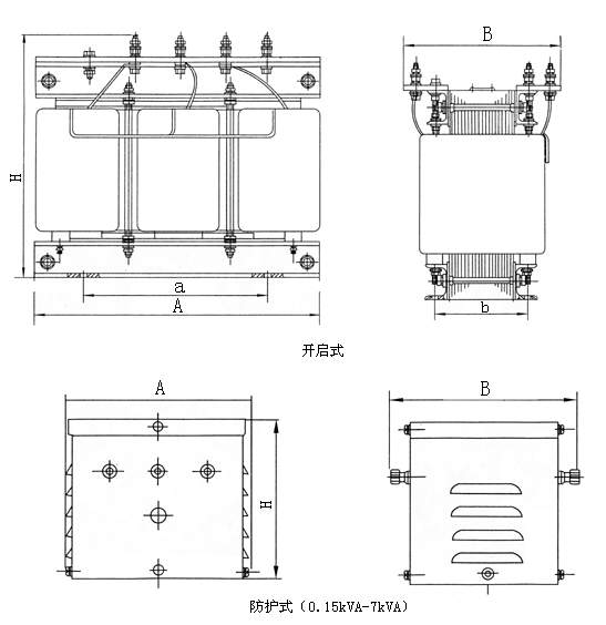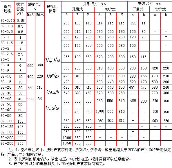 SG、SBK系列三相干式变压器可制成开启式或防护式,具有损耗低、噪声小、防火性能好和不污染环境等优点。变压器按产品的用途分为控制变压器和照明变压器;控制变压器是属于固定式变压器;照明变压器除机床用的照明变压器之外,属于可移式变压器。变压器的铁芯采用冷轧硅钢片,铁轭两侧以型钢或钢板作夹件,通过螺杆加以紧固。产品按结构分为开启式和防护式两种,防护式是采用钢板加工成箱壳,变压器在箱壳内部,箱壳外有进出线孔,以便安装电源线路。必要时可按用户要求增加电压表、电流表、温控仪、转向轮等,以便移动。