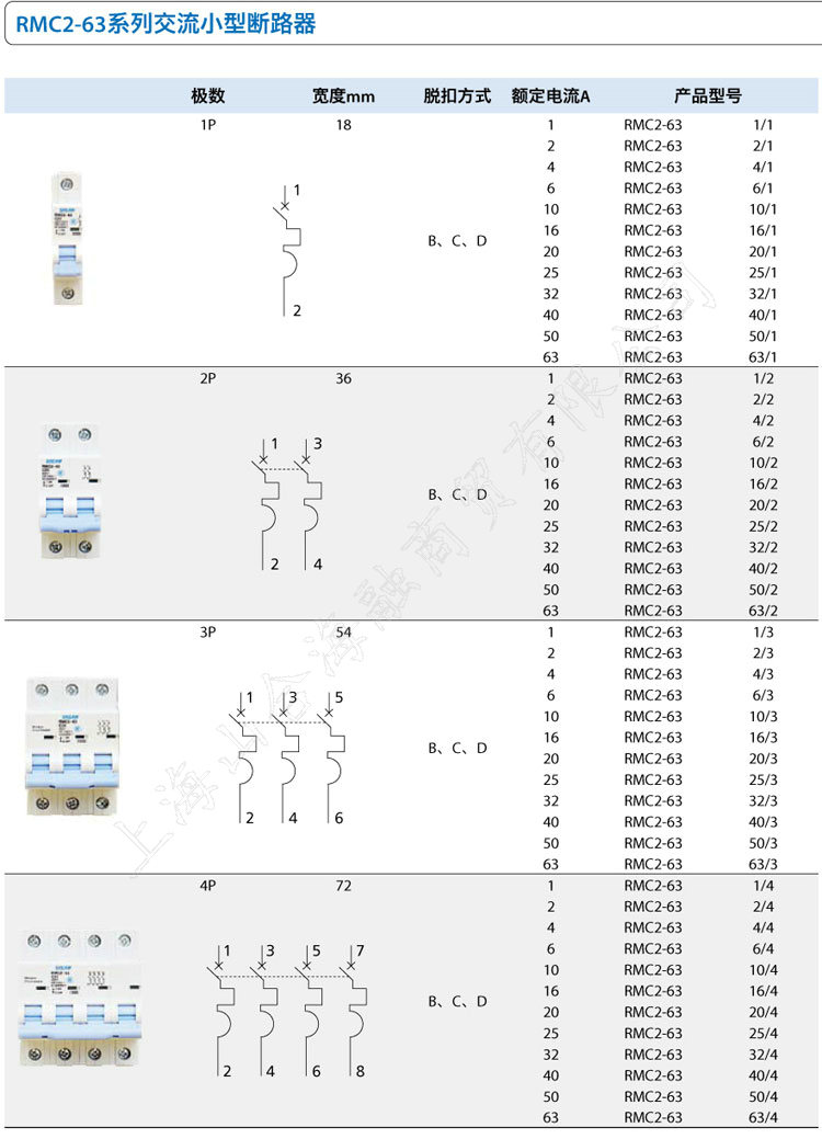 极数 宽度mm 脱扣方式 额定电流A 产品型号