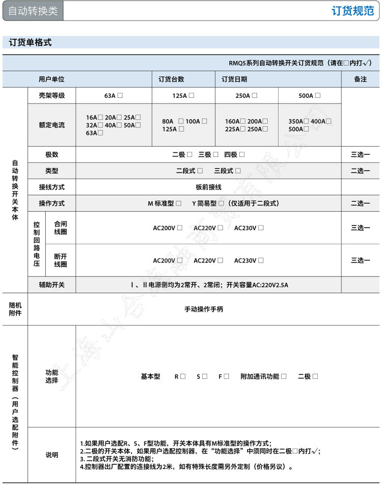 RMQ5双电源自动转换开关,由主回路、控制回路、操作机构、辅助开关等组成,用户可根据需要另行选配智能控