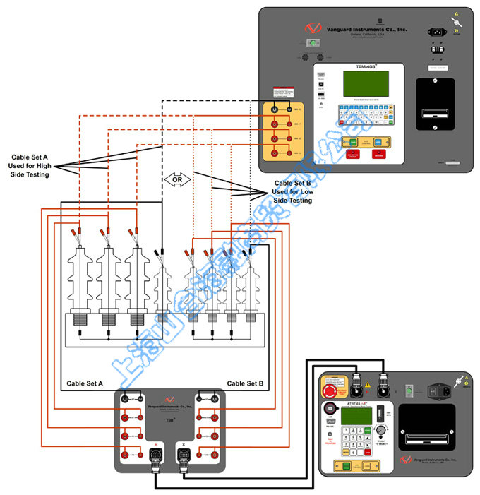 The Vanguard TSB can be used with a Vanguard ATRT-03 series turns ratio tester to perform transformer turns ratio tests using the same cable set provided with the TRM-203/403. Using the TSB, there is no need to connect and reconnect cables from the transformer after the initial connections are made. The user can conveniently perform resistance tests using the TRM-203/403 and turns ratio tests using an ATRT-03 without having to make trips to the transformer to connect and disconnect cables. |