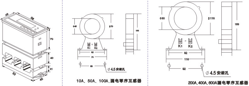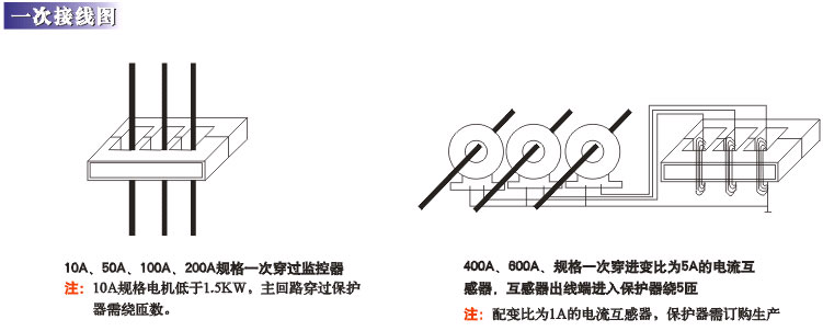 - 设定功能 可现声场额定电流、起动时间、过压值、欠压值、过流动作时间,堵转电流对额定电流的倍数、漏电电流值、通讯地址、三相电流不平衡百分比、400A、600A规格配变比电流互感器的额定电流比。